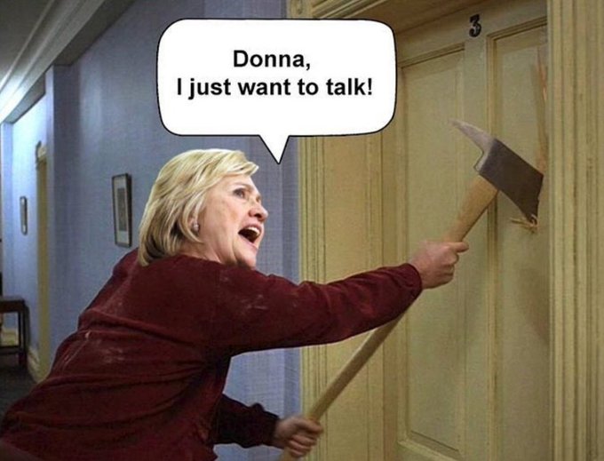 Julian Assange | Twitter | Nov 4, 2017 | Assange’s tweet shows Clinton breaking down a door using an axe, while shouting, “Donna, I just want to talk.” | .. Secret Clinton-DNC agreement proves @DonnaBrazile right. "It's for the general" is nonsense. Opposite is true. It specifies: Sep 1, 2015: Commencement Sep 11: Appointment of Clinton picked communications director Oct 1: First cash payment of $1.2m Mar 31, 2016: Termination date .. |