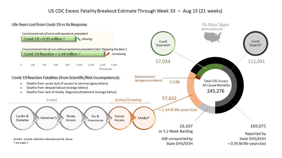 • Swedish study: 91% of COVID deaths had “extensive comorbidities”; remaining 9% had “moderate comorbidities”; COVID judged as direct cause of death in only 15% of COVID-positive deaths.